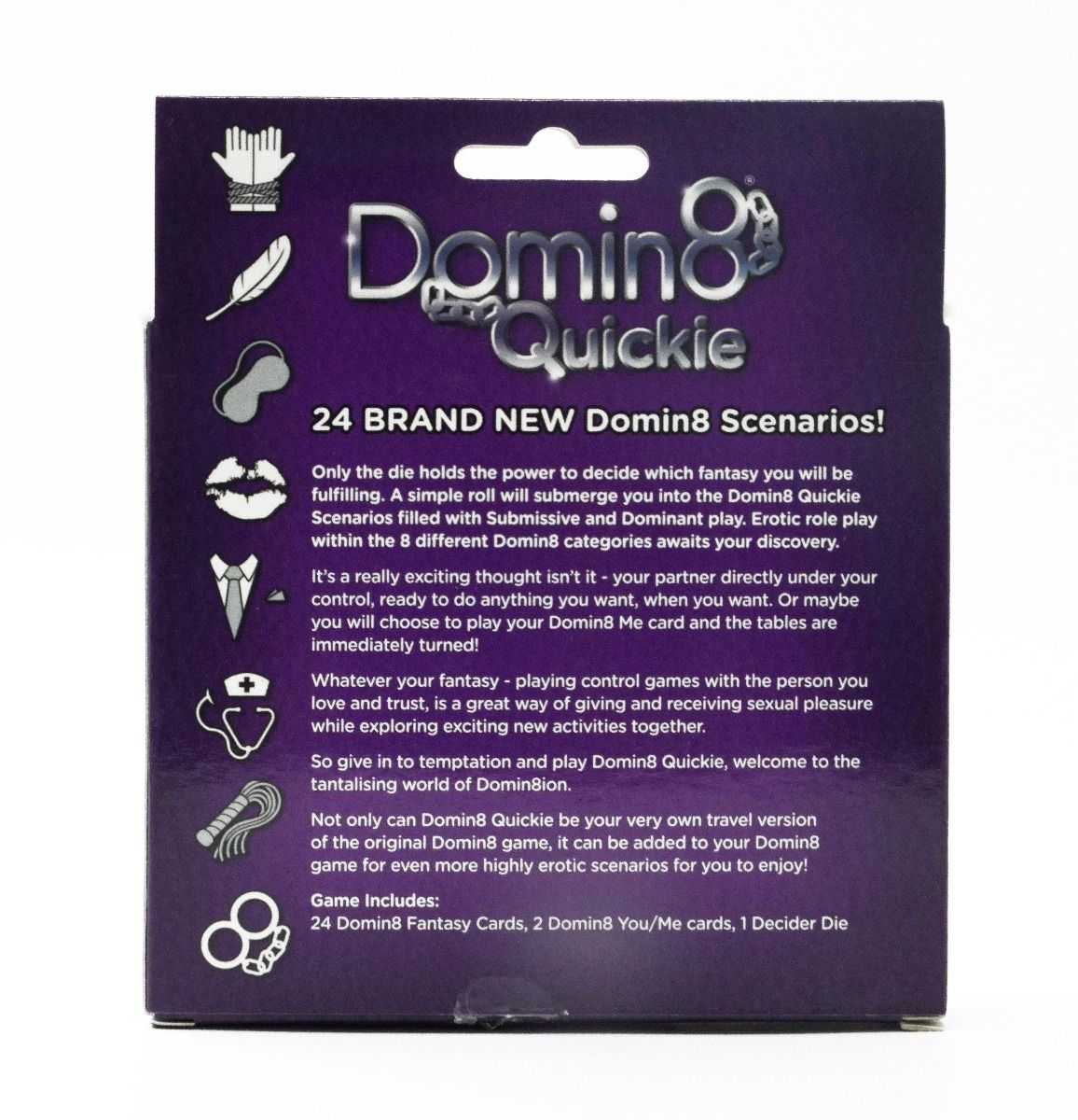 Domin8 Quickie contains 24 BRAND NEW Domin8 scenarios! Only the die holds the power to decide which fantasy you will be fulfilling. A simple roll will submerge you into the Domin8 Quickie Scenarios filled with Submissive and Dominant play. Erotic role play within the 8 different Domin8 categories awaits your discovery. Not only can Domin8 Quickie be your very own travel version of the original Domin8 game, it can be added to your Domin8 game for even more highly erotic scenarios for you to enjoy