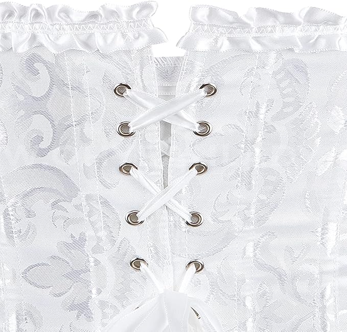 Add a touch of timeless elegance with this stunning white brocade corset, featuring intricate floral patterns, satin ribbon accents, and soft ruffle trim. Designed to flatter your curves, this structured corset includes a front busk fastening and a lace-up back for adjustable shaping, also comes with matching G-string. Ideal for bridal lingerie, burlesque styling, or elegant eveningwear.