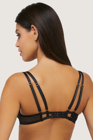 Give your lingerie collection the ring of confidence with the 'Emilia Black Mesh Double Ring Bra' - bold, sexy and designed to make a statement. This black bra with bondage appeal is cut from panels of sheer black mesh, which overlay to construct full cups that frame the bust. A large gold ring sits to the centre, whilst twin o-rings connect twin adjustable straps that lead to hook and eye fastening back.