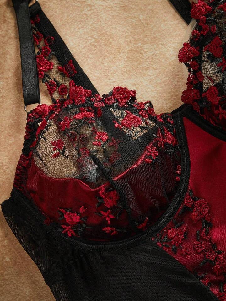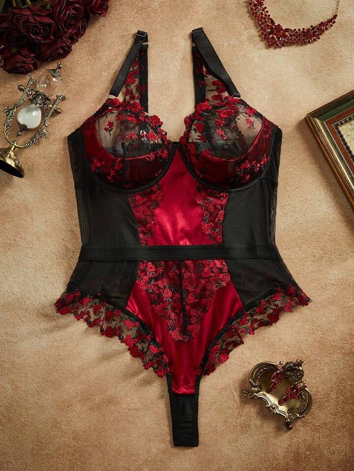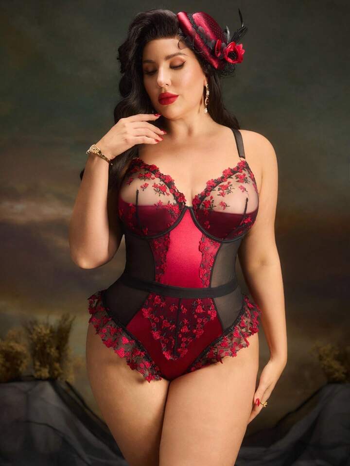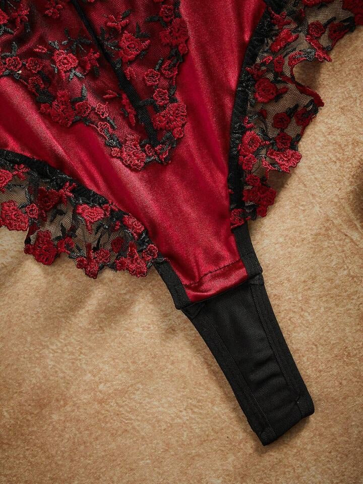 Soft curves, strong statements. This rose-detailed body is designed to seduce with every inch. A satin quarter-cup bra gives a daring lift, while full lace coverage leaves just enough to the imagination. The adjustable straps sculpt to your shape, and a flirty peplum trim at the bottom adds a playful finish and the crotch has poppers! With a thong back that dares to reveal, this piece is made for curvy babes who own every look — and every moment