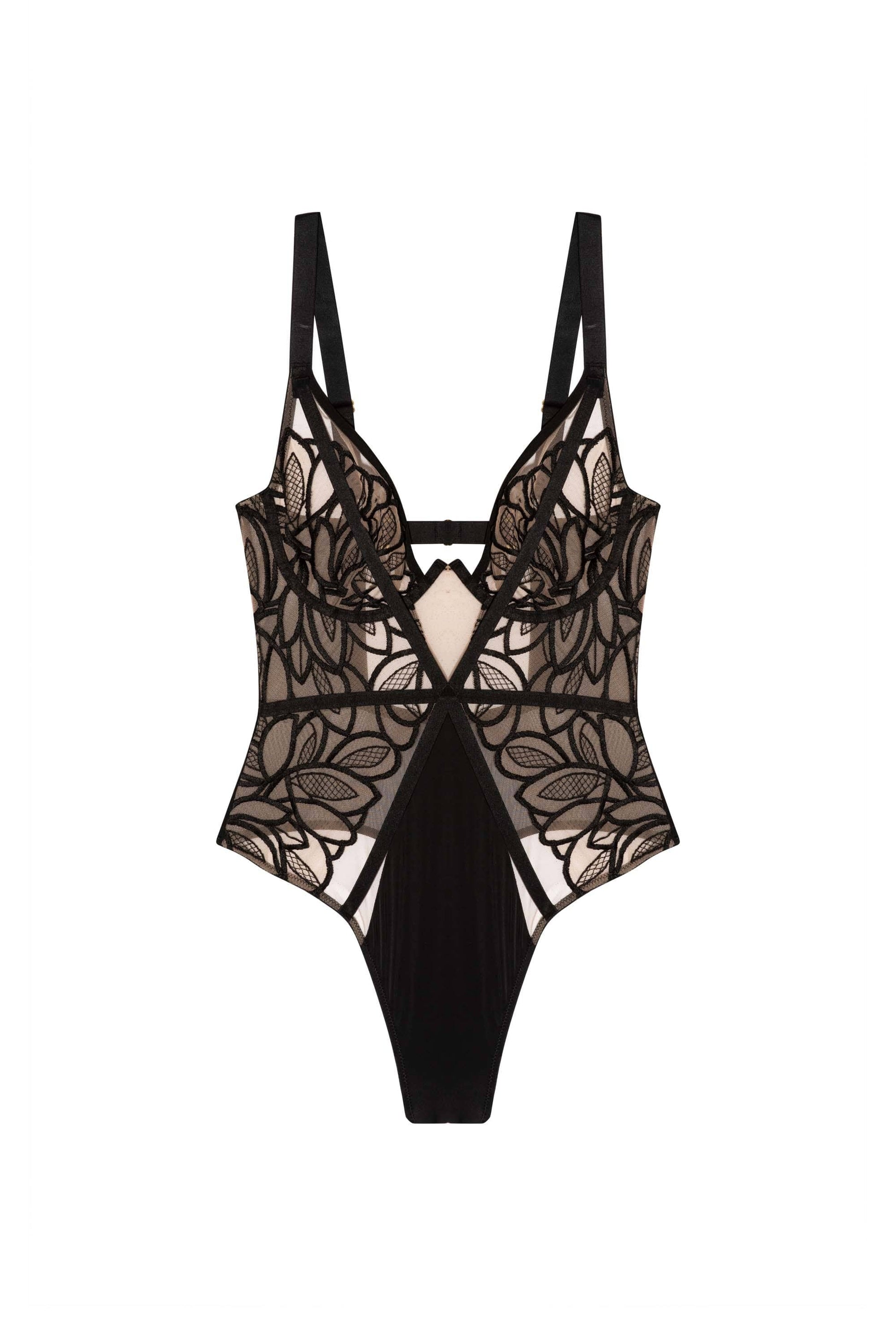 Body language never looked this good! Unleash your bold side with the Lilith Black Graphic Embroidery Body. Crafted with a sheer black mesh centre panel and nude mesh sides adorned with striking geometric black floral embroidery, this breath-taking thong body is designed to sculpt, celebrate, and subtly reveal your curves.