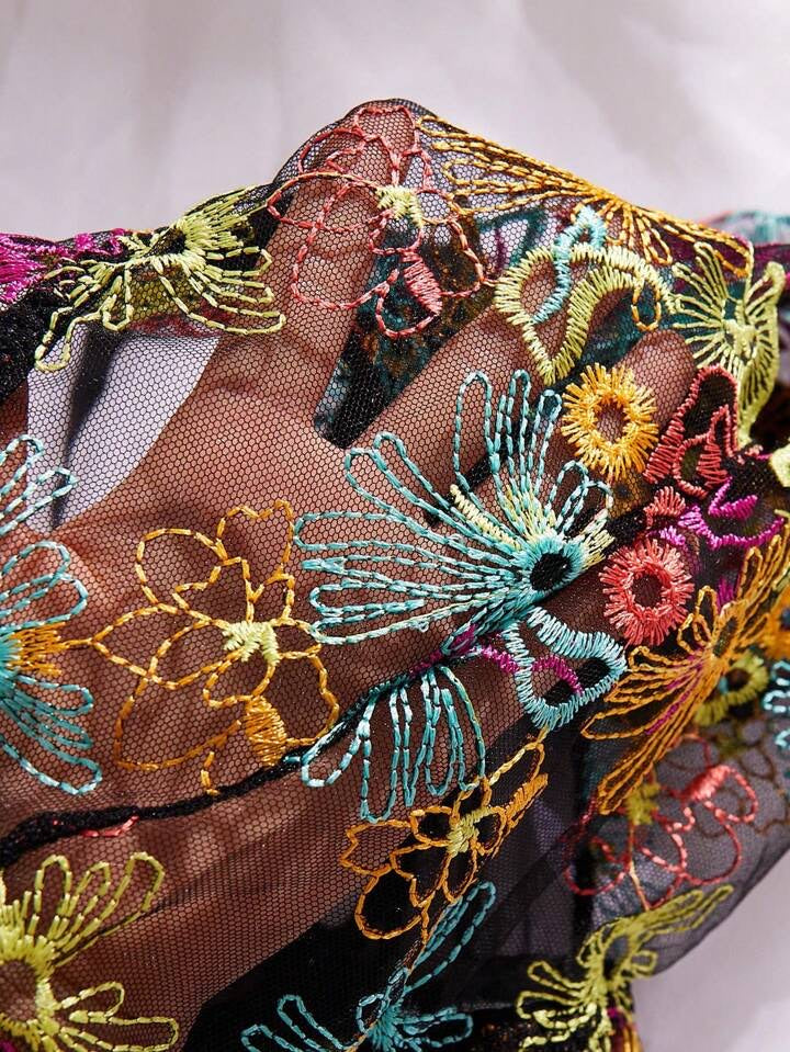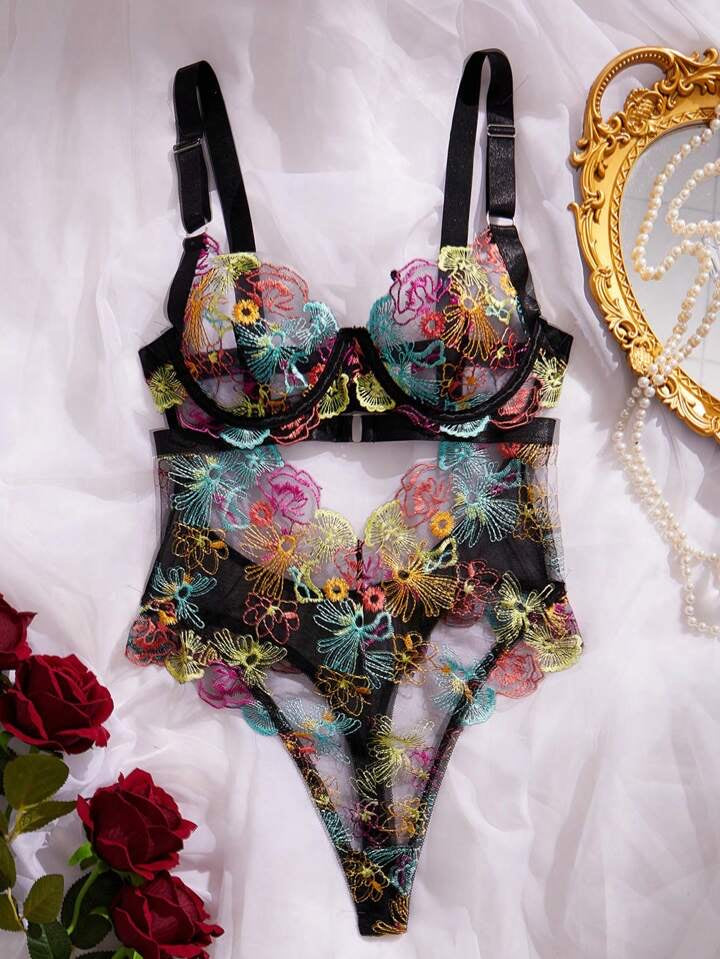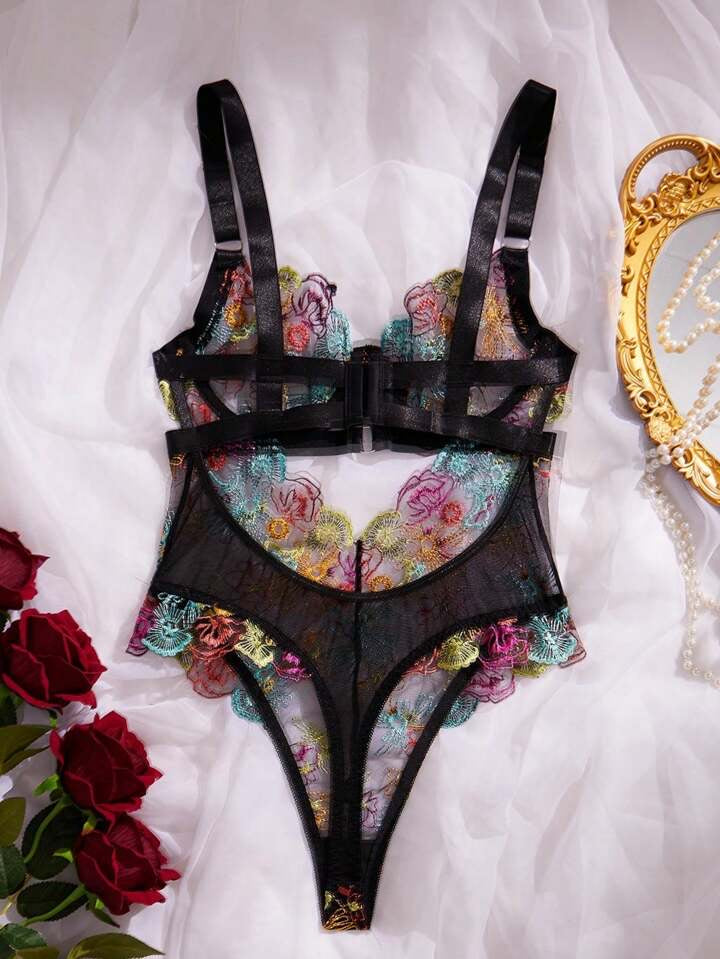 Wrap yourself in sheer temptation with this mesh bodysuit, adorned with intricate floral embroidery that seduces with every curve. The delicate, body-hugging design teases just enough, leaving little to the imagination while promising everything.