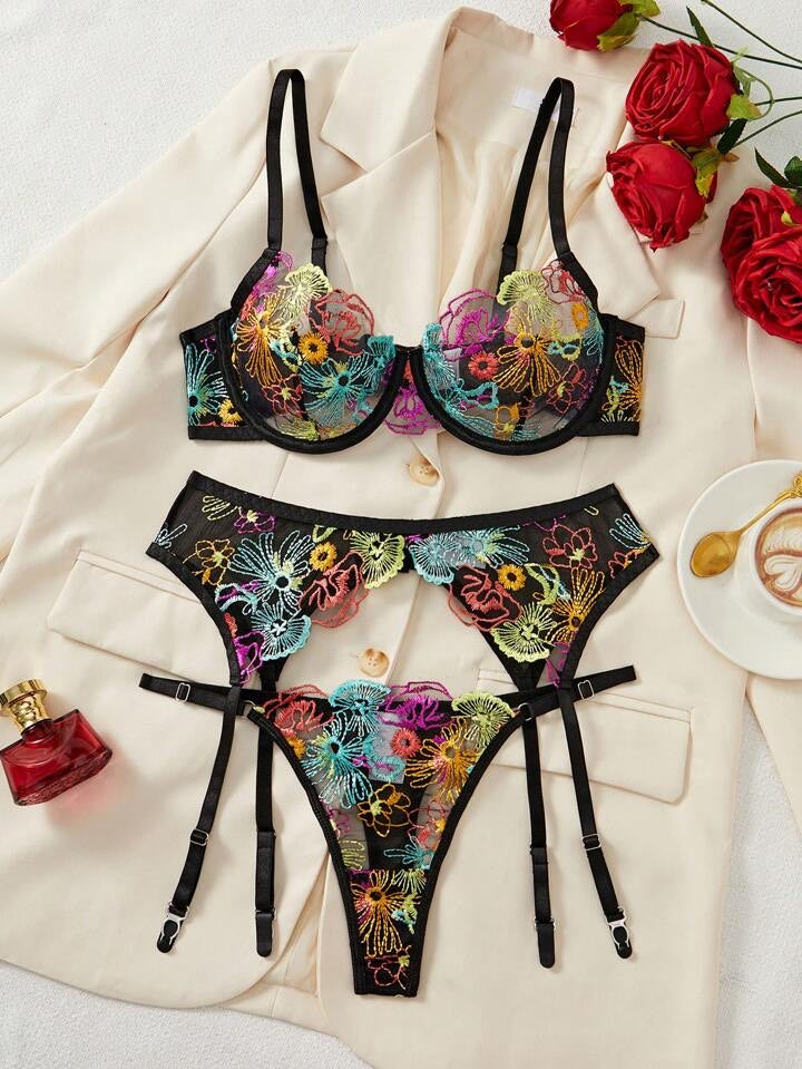 Wrap your waist in pure temptation with this black lace suspender belt, delicately adorned with vibrant floral embroidery. The contrast of dark sheer lace and colorful blossoms creates a captivating balance of soft and bold, sweet and seductive. Designed to hug your curves just right, it features adjustable straps that effortlessly connect to your favorite stockings. Whether layered for a full lingerie look or worn as a secret confidence booster, this piece is made to steal the spotlight — even if only in the bedroom.