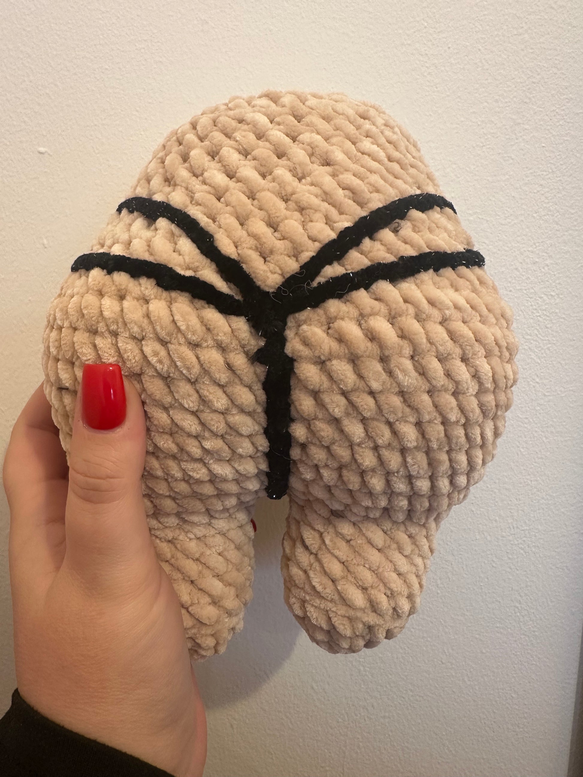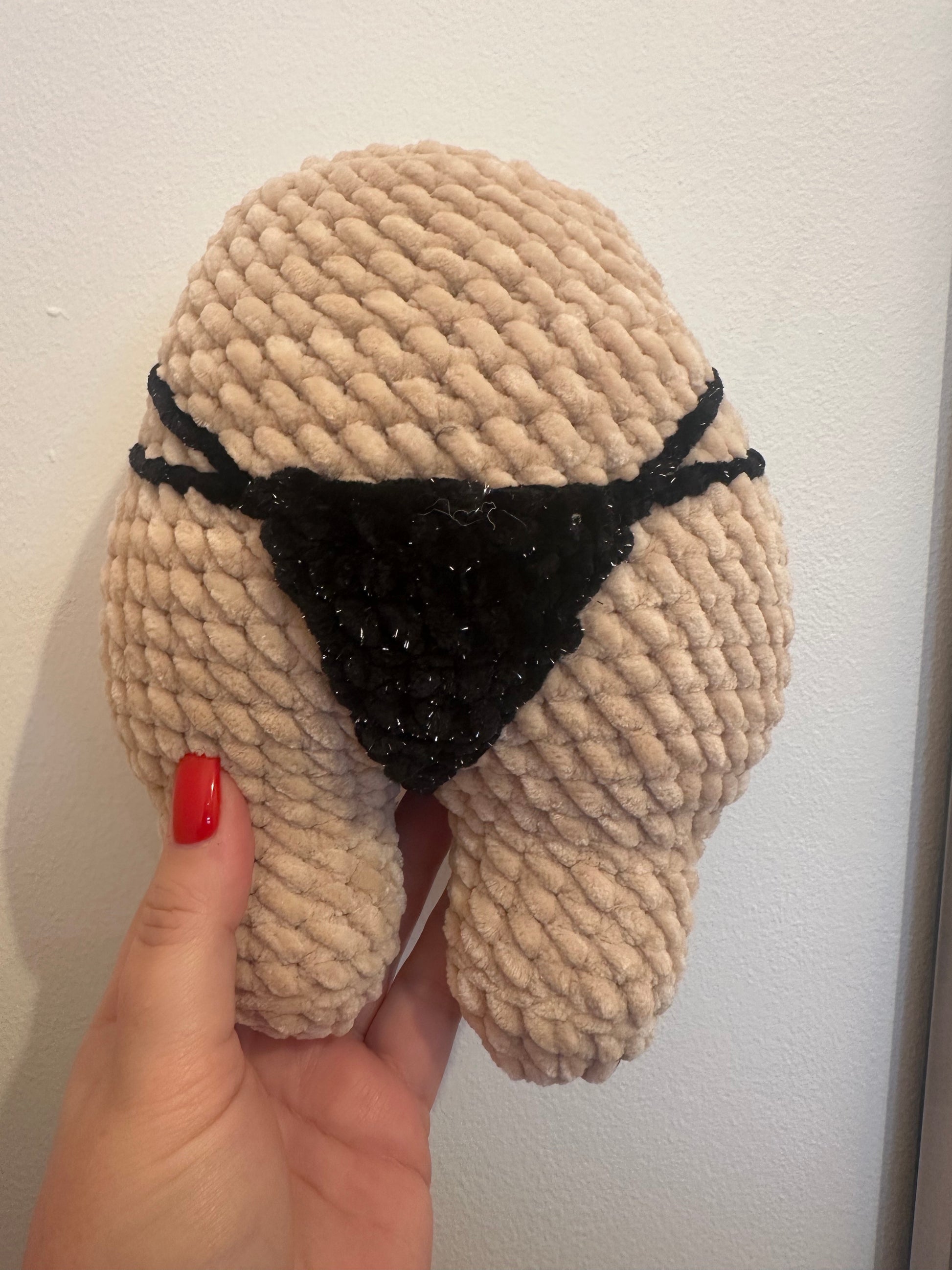 Meet Peaches!! A small, squishy nude crochet bum strutting its stuff in a playful sparkly black thong. With soft, plump cheeks and a splash of mischievous colour, this little tooshie is equal parts adorable and sassy. Perfect for giggles, shelf décor, or just a tiny dose of crochet cheeky charm, Peaches proves that even a mini bum can make a big impression!