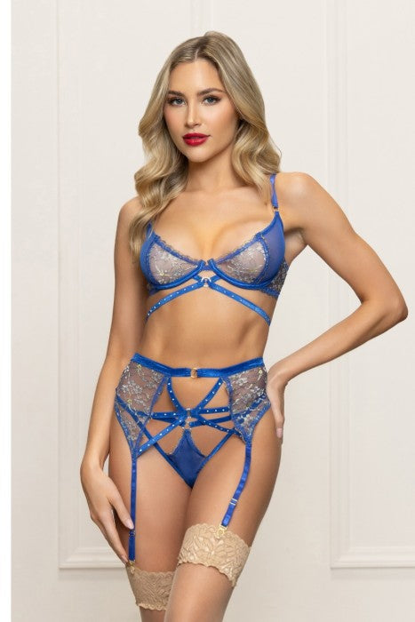 This breathtaking 3-piece set, crafted from royal blue Lurex lace and mesh, exudes a perfect blend of elegance and seduction. The underwired bra lifts and shapes, adorned with shimmering gold accents that catch the light with every movement. Paired with a matching thong, designed to caress your curves, and a seductive garter belt that adds a final touch of glamour, this set is the ultimate expression of luxury. Every piece is designed to feel as indulgent as it looks, enveloping you in sensual sophistication with each wear.
