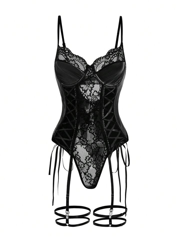 Delicate lace scallop edging frames the bust and traces a tempting line down the center of the body, adding a touch of soft romance to the bold design. At each side, lace-up ribbons invite the eye — and the imagination — to linger, creating a teasing contrast of texture and tone.