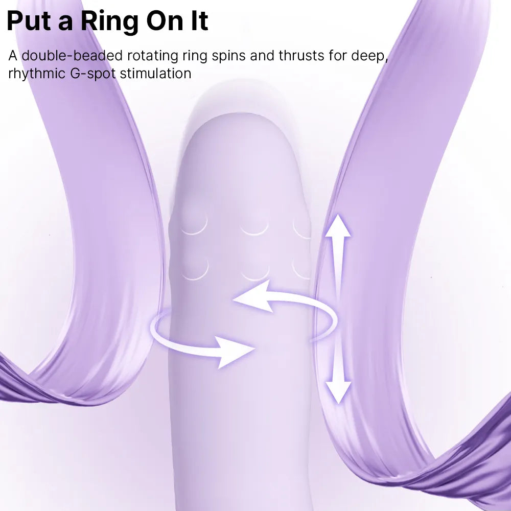 The vibrator delivers deep, rumbly vibrations and rhythmic thrusts, powered by a double-beaded rotating ring. The stimulator teases with pulsating precision, and when you want to mix things up, it doubles as a wireless remote—perfect for playful surprises, whether you’re together or apart.