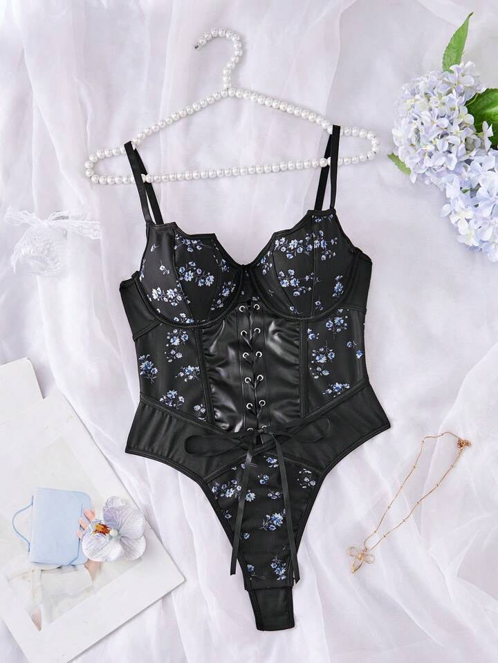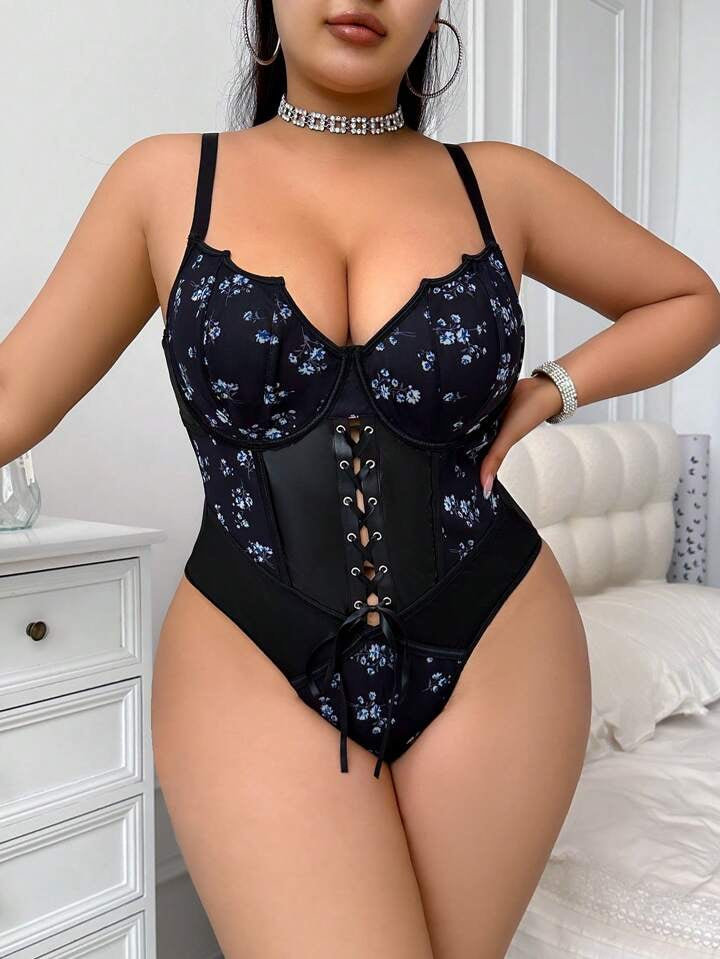 Darkly romantic with a daring edge, this black and navy body is pure seduction. Underwired cups give the perfect lift, while blue floral embroidery adds a touch of elegance. The wet-look lace-up detail down the centre draws the eye and teases the imagination. It's fierce, floral, and made to be unforgettable.